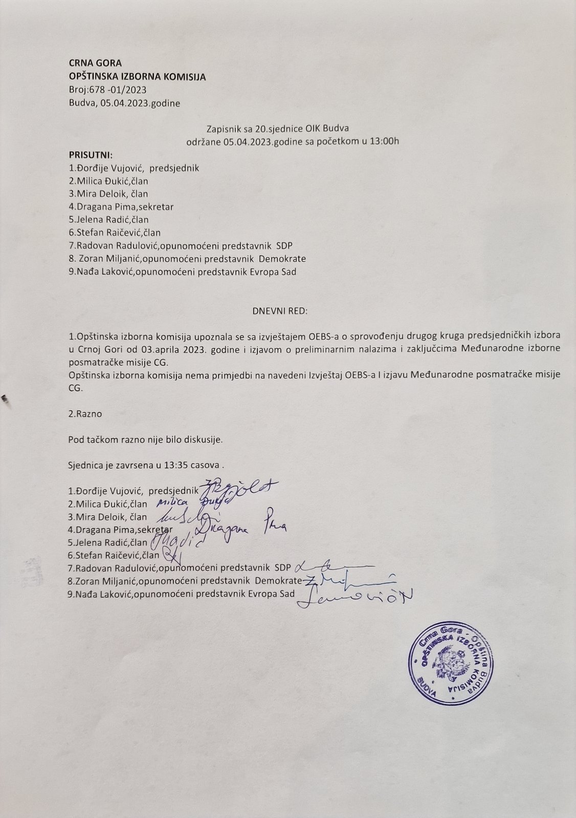 Zapisnik sa XX sjednice OIK Budva